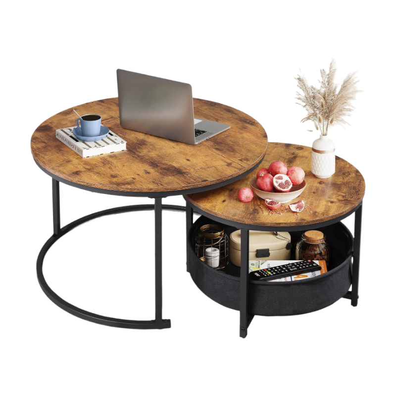 WLIVE Couchtisch-Set, 2-teilig, runder Beistelltisch mit Stauraum, Wohnzimmertisch mit Stoffkorb, Metallgestell, Couchtisch für Wohnzimmer (Rustikales Braun)