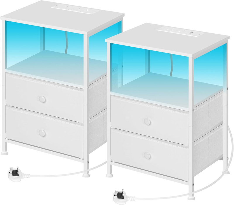WOLTU 2er-Set Nachttische mit Ladestation, LED-Beleuchtung, 2 Schubladen & Ablage, Weiß