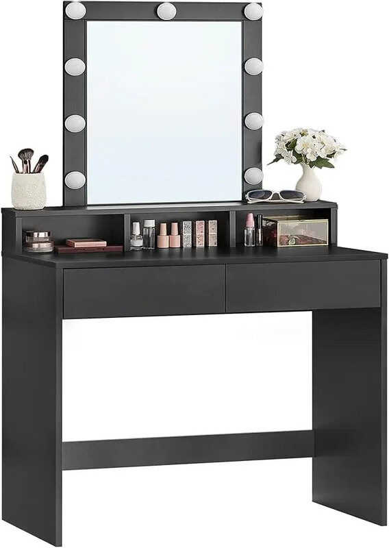 VASAGLE Coiffeuse avec LED réglable, miroir intégré, 2 tiroirs et 3 compartiments ouverts - Noir moderne