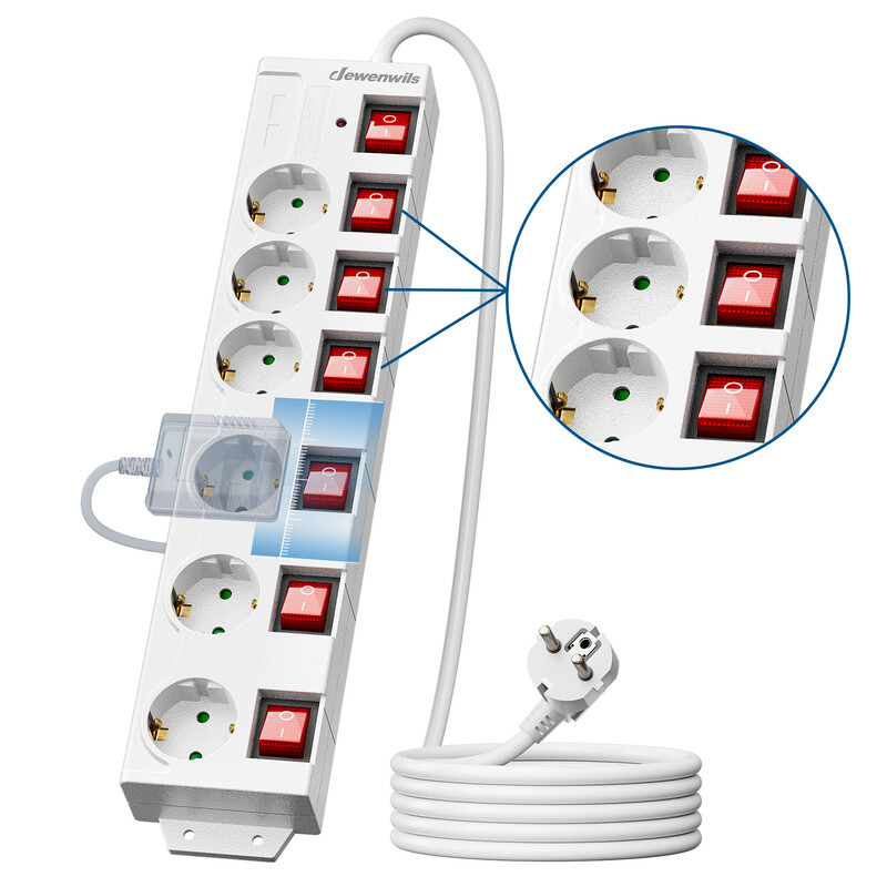 DEWENWILS Multiprise 6 prises avec 2 ports USB, interrupteurs individuels sur chaque prise et port USB, protection contre les surtensions, sécurité enfant, prises orientées à 90°, câble 3 m - Blanc