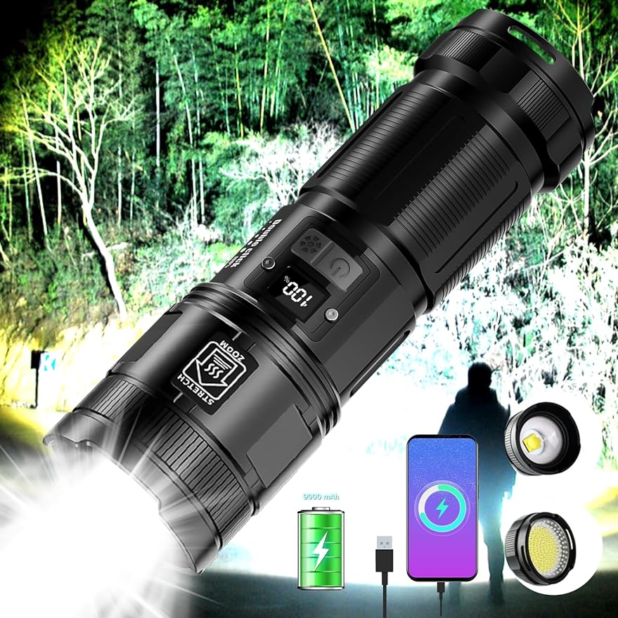 XHP90 Oppladbare LED-lommelykter med digitalt display 12000 Høye lumen Zoombar lommelykt for nødsituasjon Camping Strømbrudd Svart