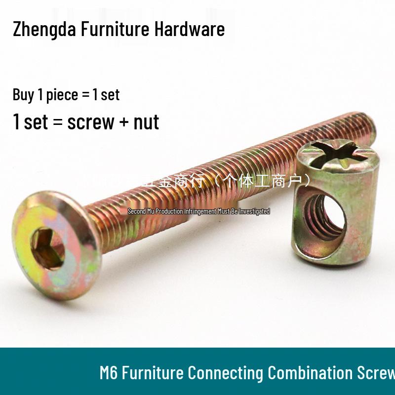 M6 Möbelbeslag: Spjälsängs- och bokhylleskruvar med krysshålsmuttrar, försänkta skruvar, hammarmuttrar.