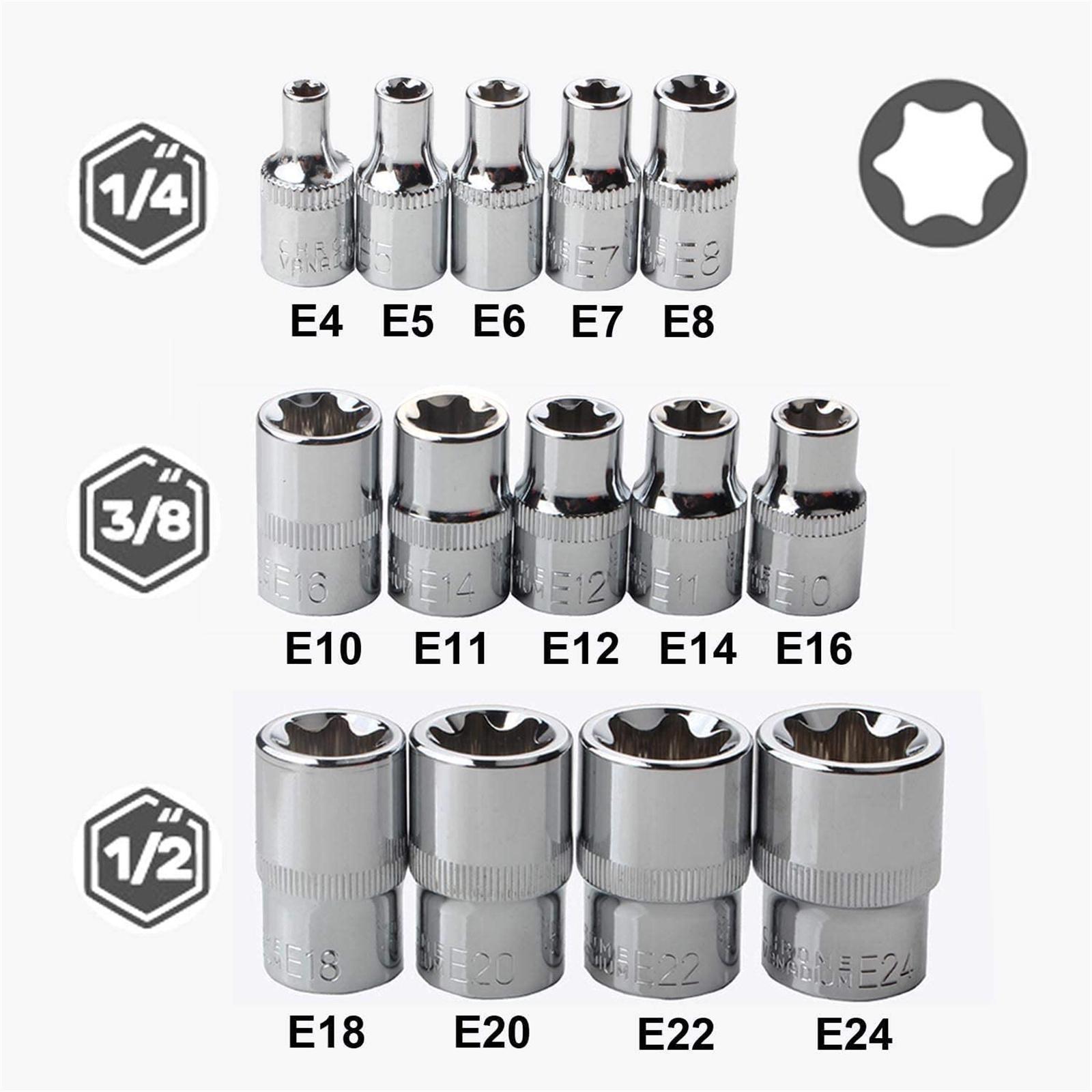14-delat E-TORX Socket Set 1/4 3/8 1/2'' Drive E-4 - E24 Externt vridmoment Star Socket Kit med förvaringsväska