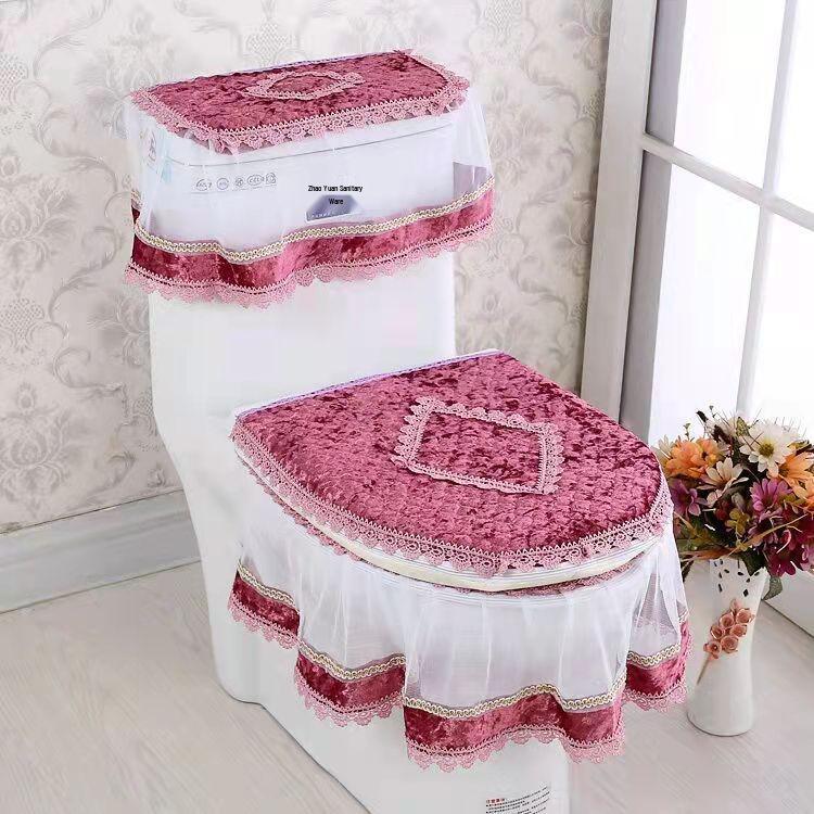 Toiletbrilhoes set van goud fluweel en kant in Koreaanse stijl: 3 Stuks met Toiletmat & Stofhoes.