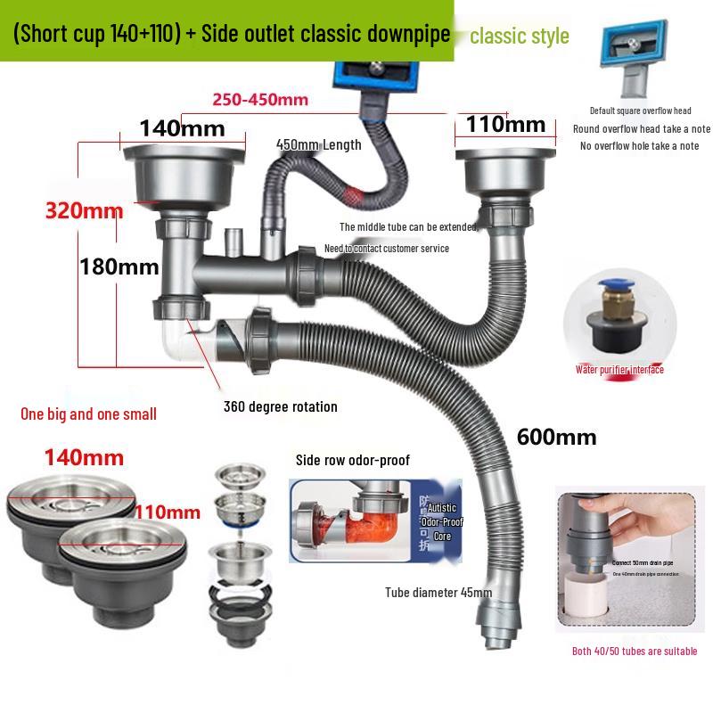 Kjøkkenvask dobbel vaskekum av rustfritt stål, avløpsenhet