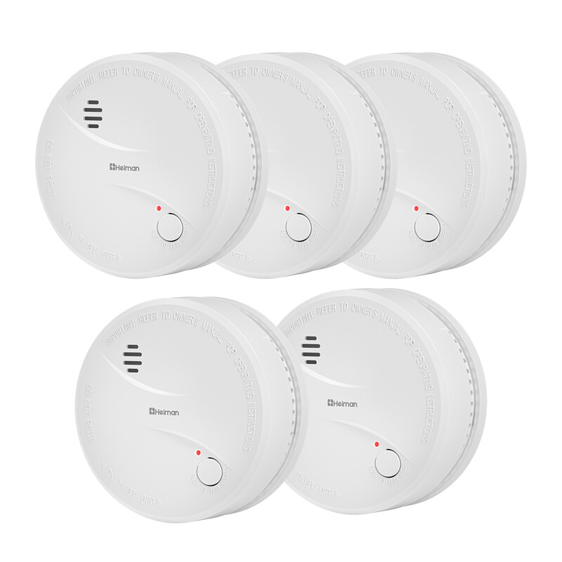 HEIMAN Lot de 5 détecteurs de fumée Wi-Fi WLAN intelligent, avec application, batterie remplaçable, alarme 85 dB et bouton d'arrêt, conforme EN 14604