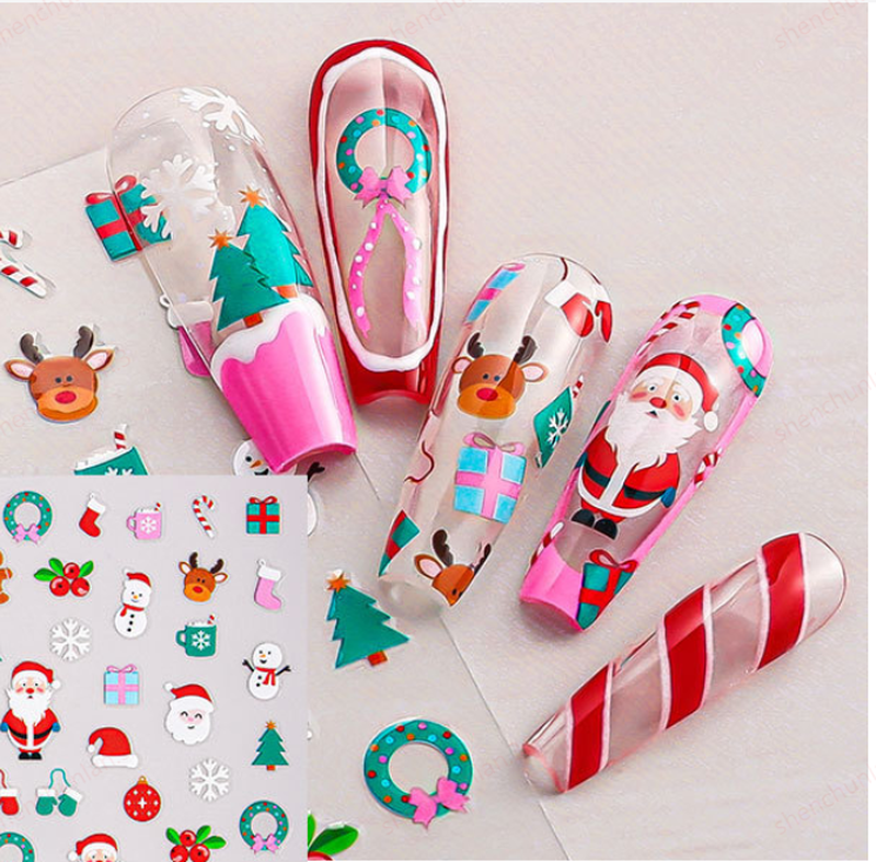 MeoMagic Zelfklevende gel nagelstickers, kerstthema: sneeuwman, kerstboom, sneeuwvlok, geschenk, rendier, roze-wit-rood-groen, 1 set