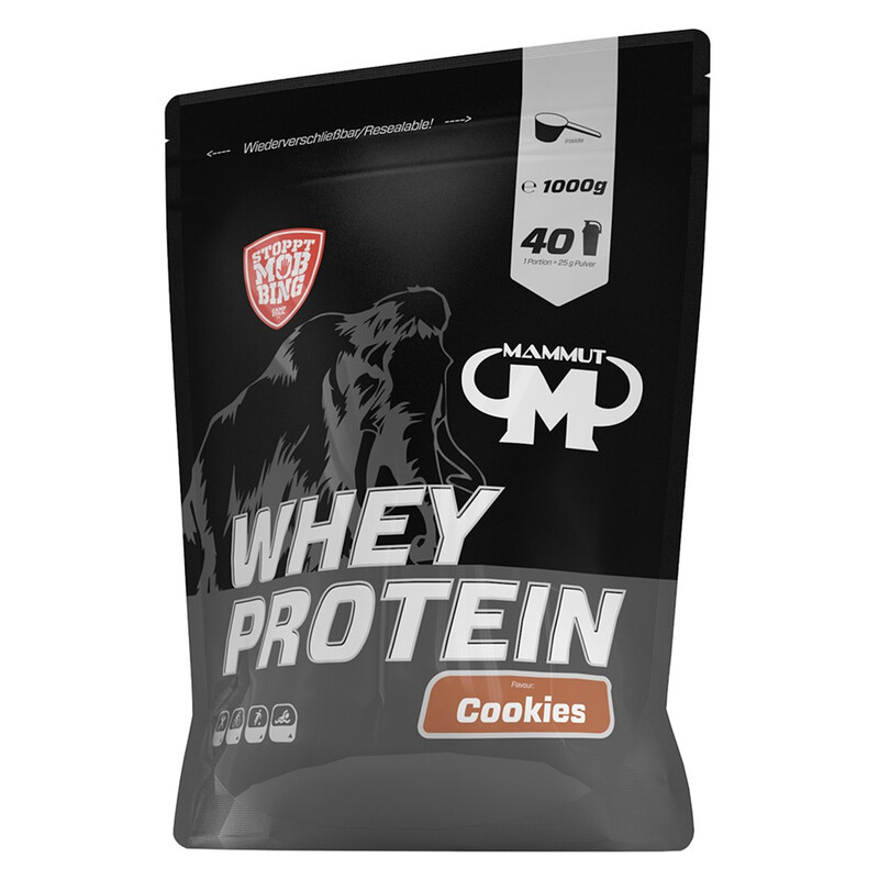Mammut Nutrition Whey Protein Pulver Cookies – 1kg – 27g Protein pro Portion – Eiweißpulver mit hohem BCAA-Anteil – Perfekte Löslichkeit in Wasser & Milch – Ideale Zwischenmahlzeit