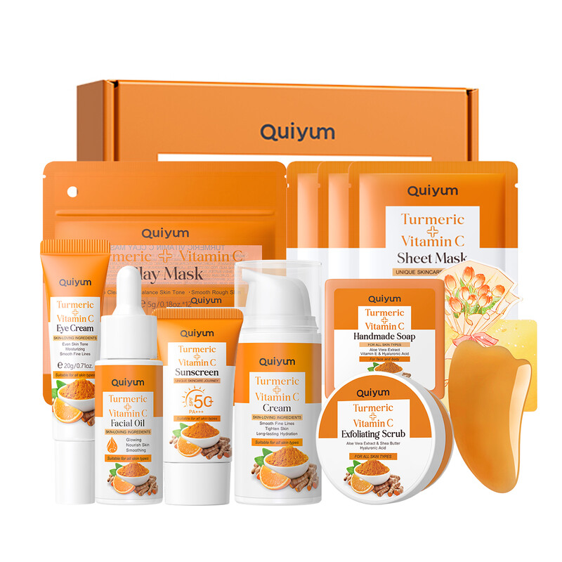 QUIYUM New Year Gift Turmeric Vitamin C Skincare Set (11pcs) - Turmeric Soap 100g, Scrub 100g, Serum 17ml, Eye Cream 20g, Face Cream 30g, Face Mask 25g×3, Sunscreen 50g, Mud Mask 5g×12, with Facial Scraper