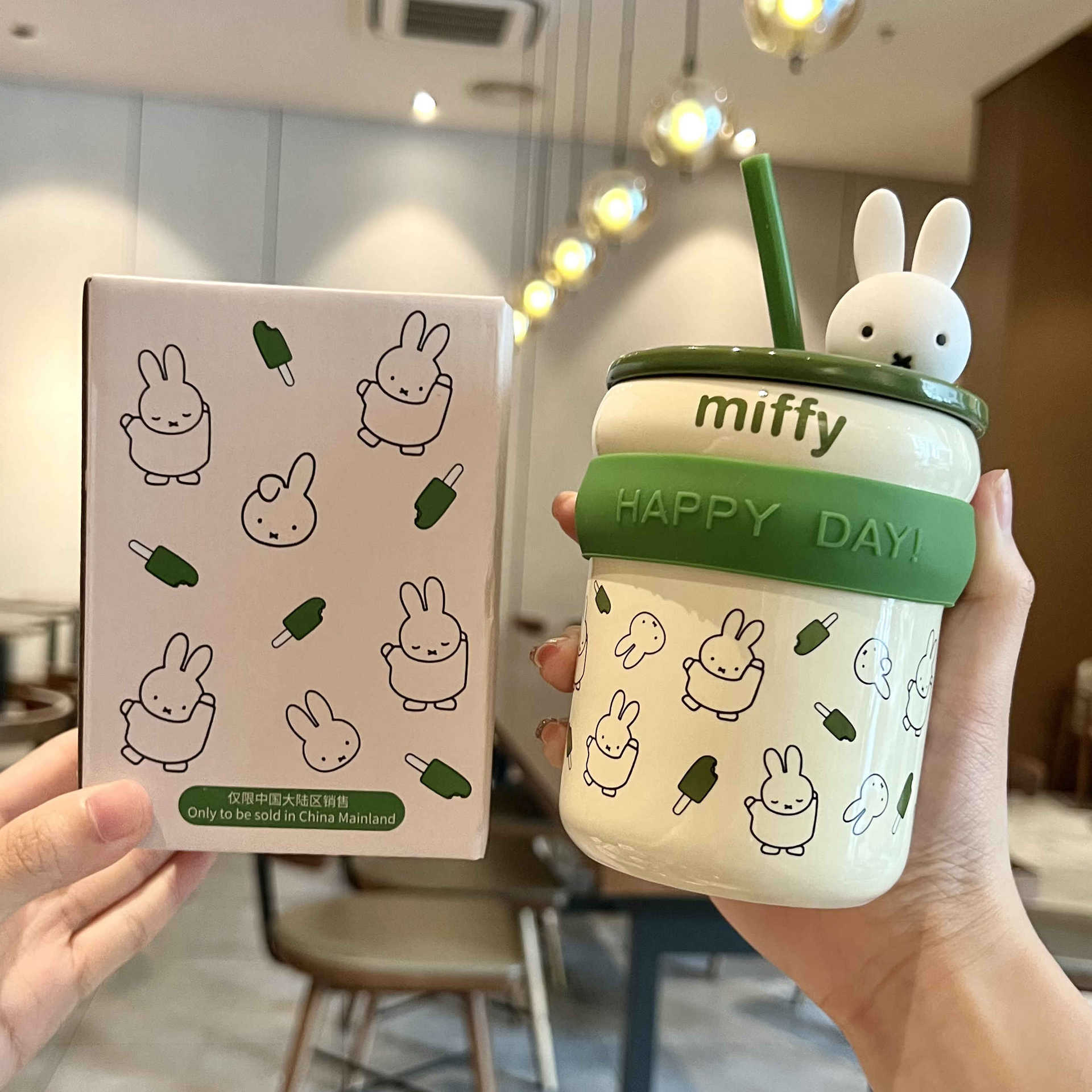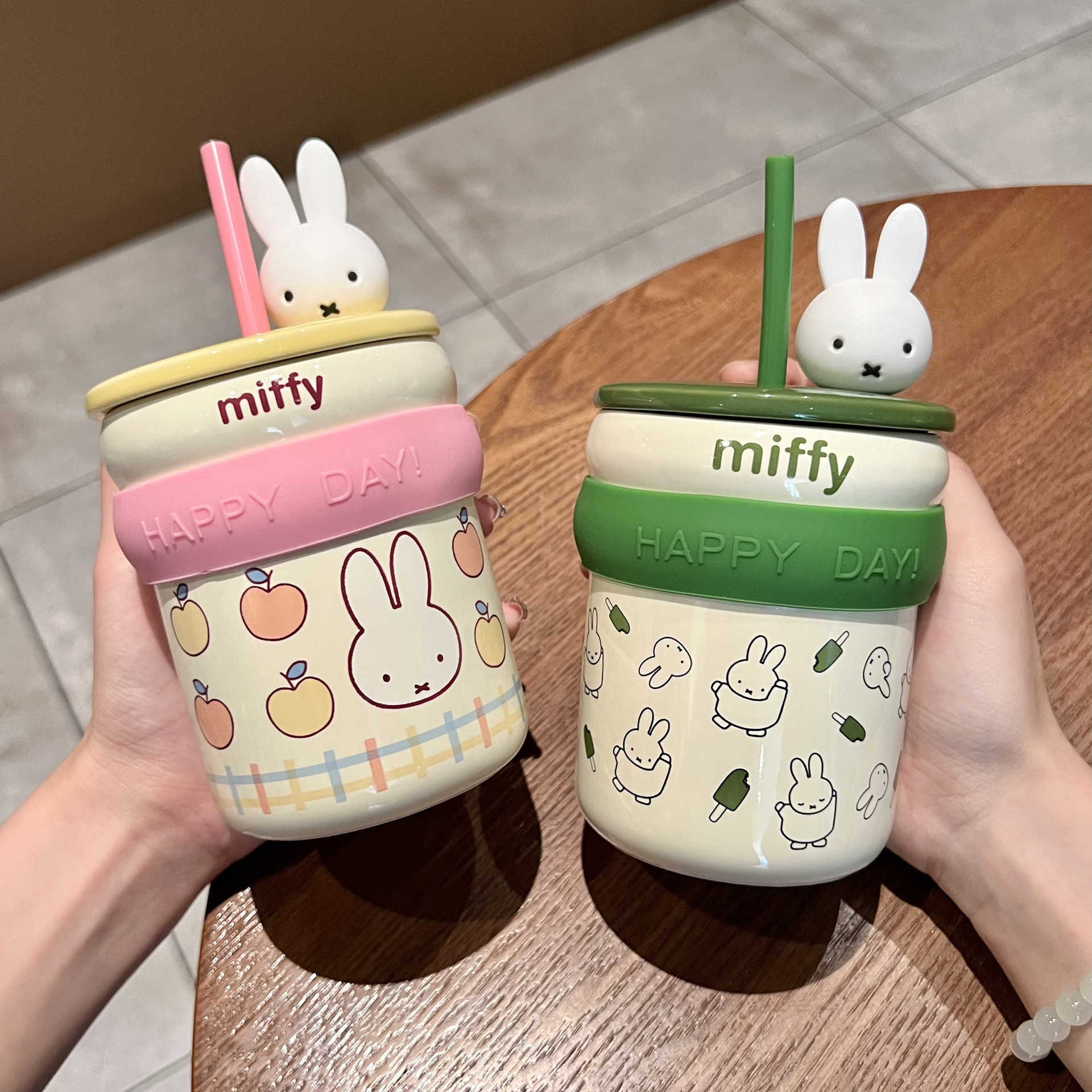 Birthday Gift Miffy Rabbit Straw Water Cup for Girls Ceramic Mug with Lid Office Coffee Cup Souvenir Gift
