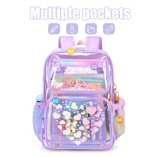 Sac à dos transparent pour enfants, imperméable, sac à dos d'étudiant avec imprimés cœur d'amour, sac à livres avec poches zippées avant pour garçons