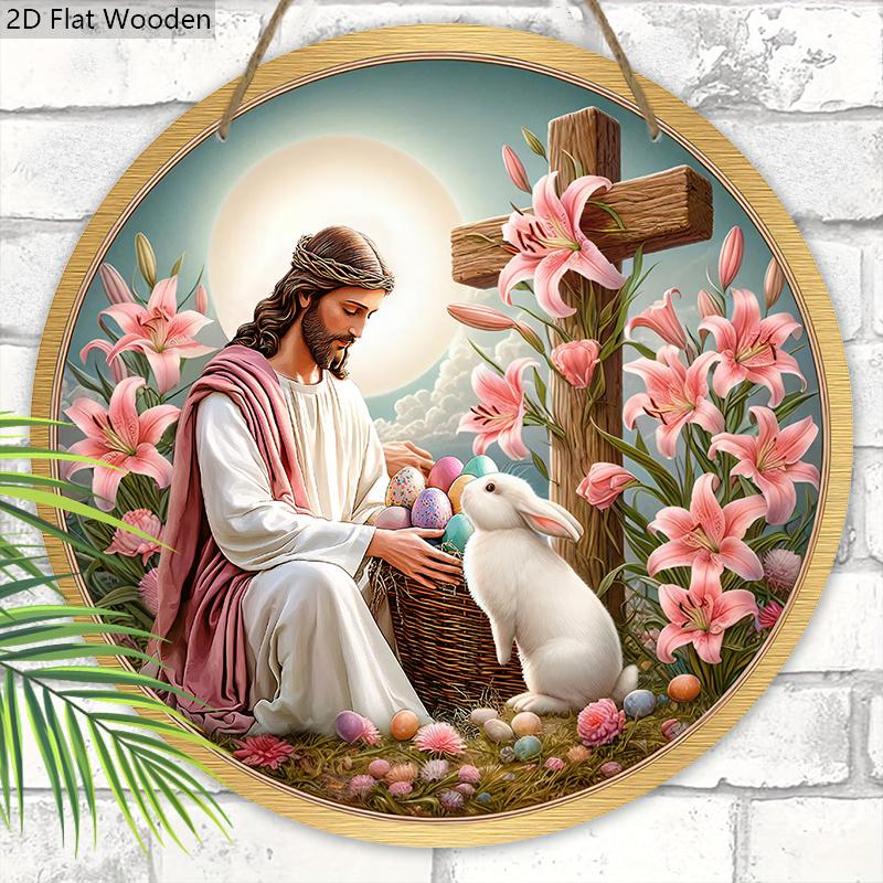 Påskehare Jesus Tre Skilt - Påskeegg Blomster Kors Rund Pynt til Ytterdør, Vegghengende Dekorasjon - Ideell Påskepynt Rosa