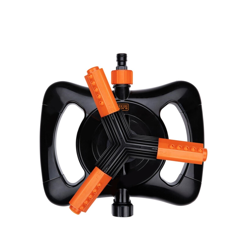 BLACK+DECKER Rasensprenger 3 Arme – 360° Bewässerung – 25 x 24 x 8 cm – Gartenschlauchanschluss – Schwarz/Orange
