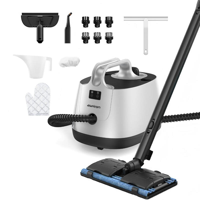ASPIRON Dampfreiniger, 1500 W, 4 bar, bis zu 145 °C heißer Dampf, 1,5 l Wassertank, 21 Zubehörteile, chemiefreie Reinigung für Böden, Fenster, Fugen, Polster, Teppich und Auto, grau