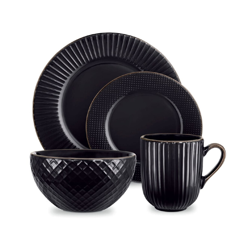Tower Empire 16 Piece Dinnerware Set, Black & Brass