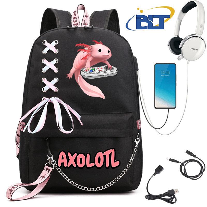 Schattige Axolotl bedrukte studentenschooltas voor meisjes zwarte rugzak usb kindertas casual tas terug naar school cadeau