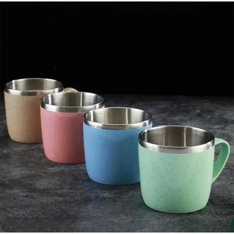 RVS Bekers met Handvat, Dubbellaags Anti-verbrandings Tarwestro Kleine Waterbeker, Kantoor Koffie Melk Thee Drank Mokken beige