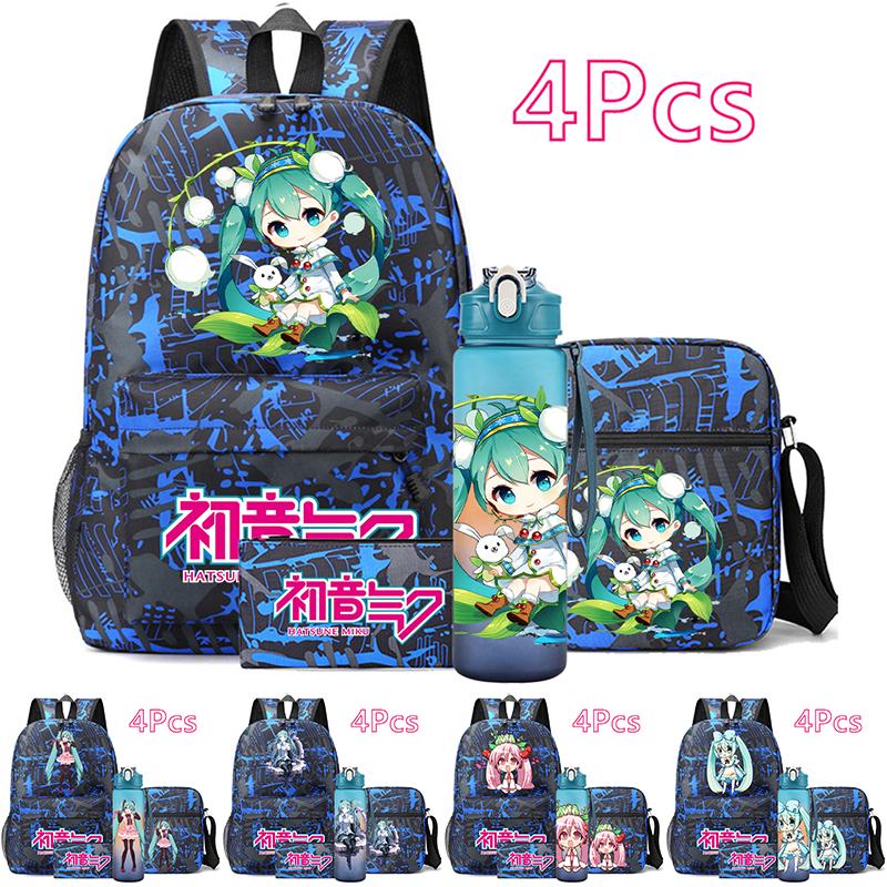 4Pcs/set Anime Hatsune Miku Printed Backpack Large Capacity Bookbag Shoulder Bag Pencil Case with 750Ml Water Bottler Waterproof Schoolbag