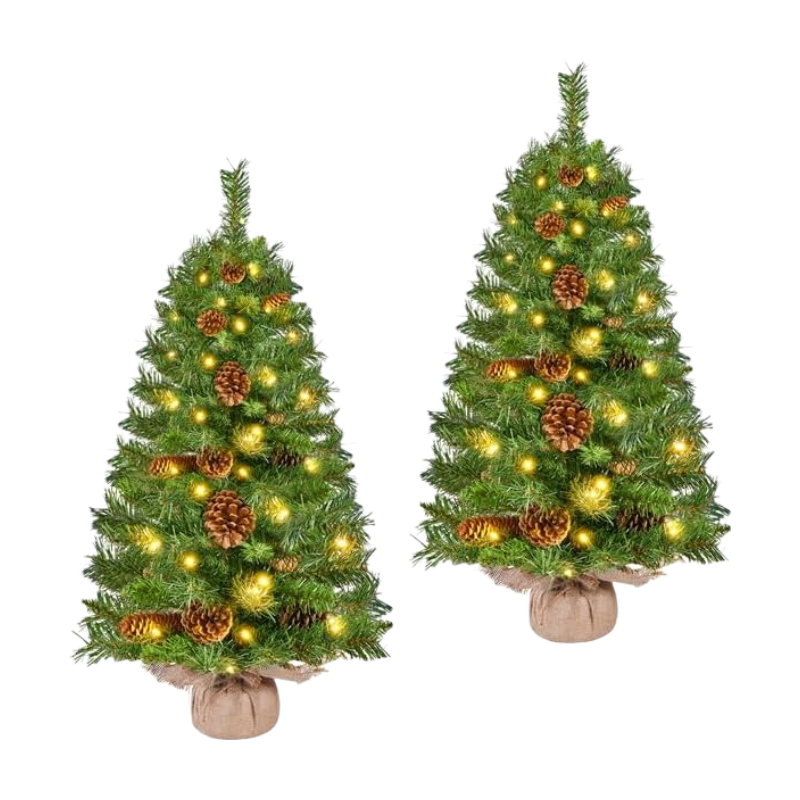 Yaheetech Set mit 2 90 cm Tisch-Weihnachtsbäumen, batteriebetriebener Mini-Kunstweihnachtsbaum mit Kiefernzapfen, 50 warmweiße LED-Lichter und Betonsockel mit Jutebezug, grün