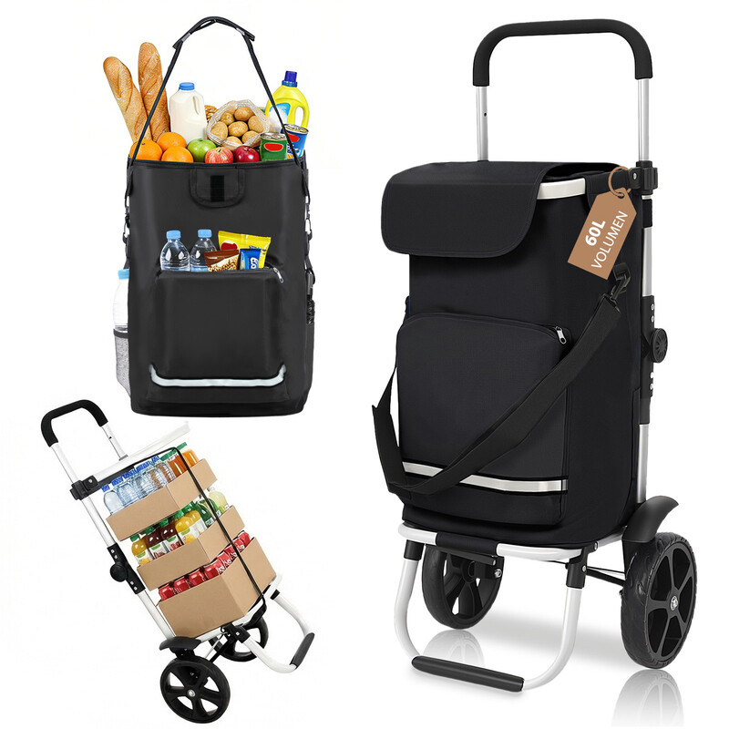Chariot de Courses Pliable avec Sangle de Fixation, Caddie Isotherme 3 en 1 avec Sac à Bandoulière et Porte-Bouteille, Trolley et Diable Pliable Idéal pour Les Courses et Le Camping – Noir