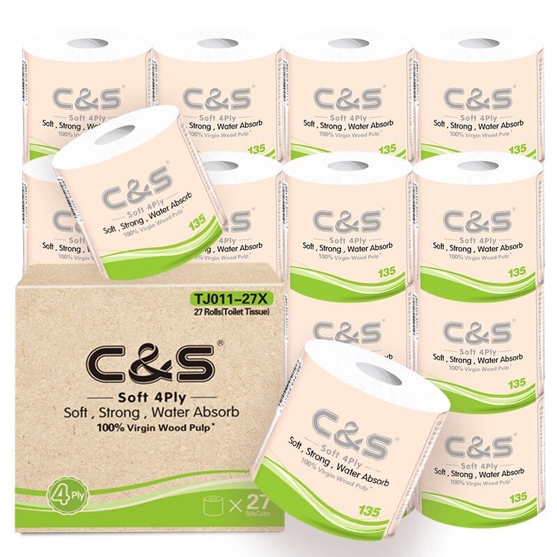 C&S Rollen-Toilettenpapier aus frisch gepresstem Holzpulver, 4-lagig, 135 g, 27 Rollen, duftfrei, hautfreundlich und weich, extra dick, strapazierfähig, Familienpackung für Vorrat und sparen