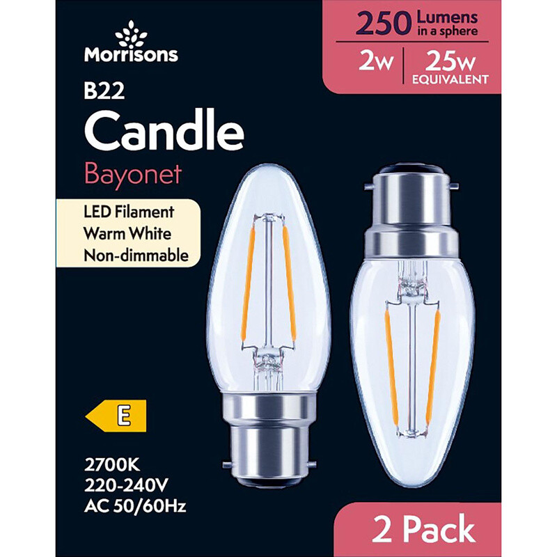 Morrisons Light Bulb LED Candle Filament Bayonet B22 Warm White 2W 250 Lumens 2pcs