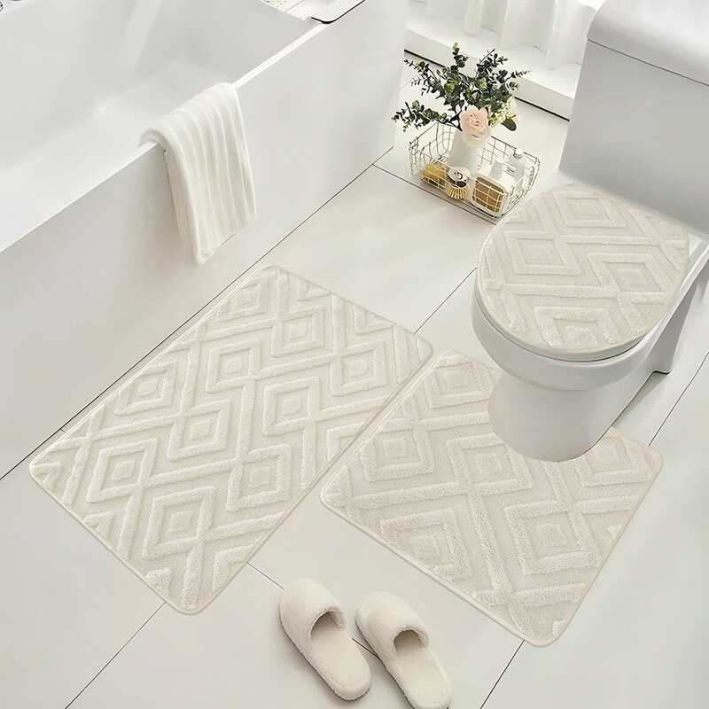 WhereHike Ensemble de 3 pièces lavables en machine en microfibre ultra douce et antidérapante motif losange beige - Housse de cuvette 38 x 44 cm, tapis contour en U 50 x 40 cm, tapis de salle de bain 50 x 80 cm