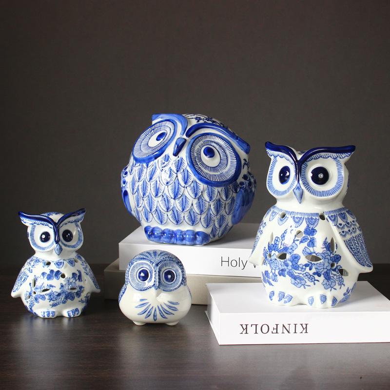 Blauw en Wit Porseleinen Uil Beeldje: Elegante Keramische Woondecoratie en Welvaart-Aantrekkend Verhuiscadeau