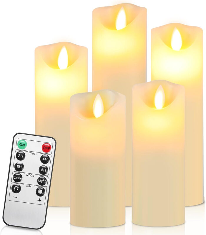 Yakimz LED Kerzen Mit Timerfunktion | Flackernde Echtwachs Mit 10-Tasten Fernbedienung | 5er Set 13/14/16/18/20cm Flammenlose-Kerzen (Elfenbein)