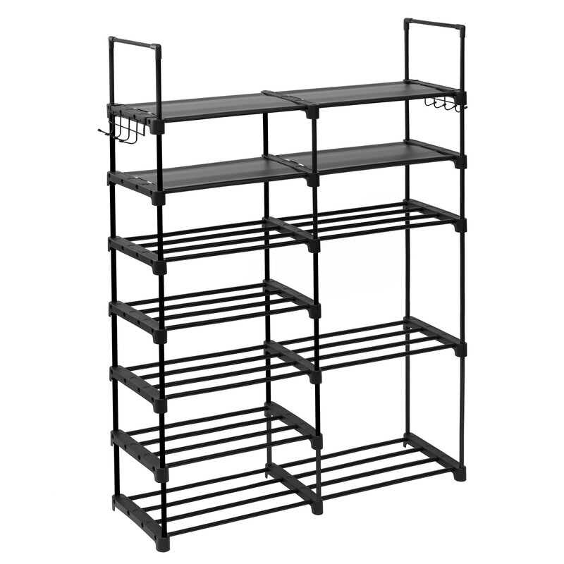 eSituro Schuhregal mit 7 Ebenen, Schuhschrank für Flur Eingangsbereich, Metallschuhregal, Schuhaufbewahrung mit 10 Haken, Schuhorganizer Schwarz