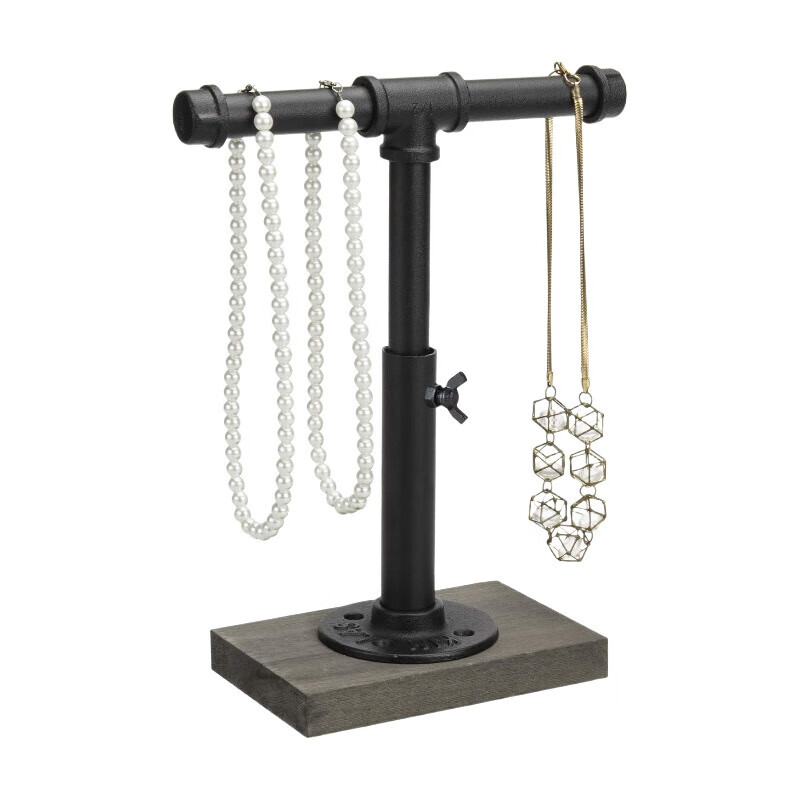 MyGift Höhenverstellbarer Industrierohr-Organizer-Ständer - Rustikaler T-Bar für Schmuck, Kopfhörer, Medaillen, Küchenutensilien & Display, Graue Holz-Basis (Schwarz/Grau, Landhausstil)