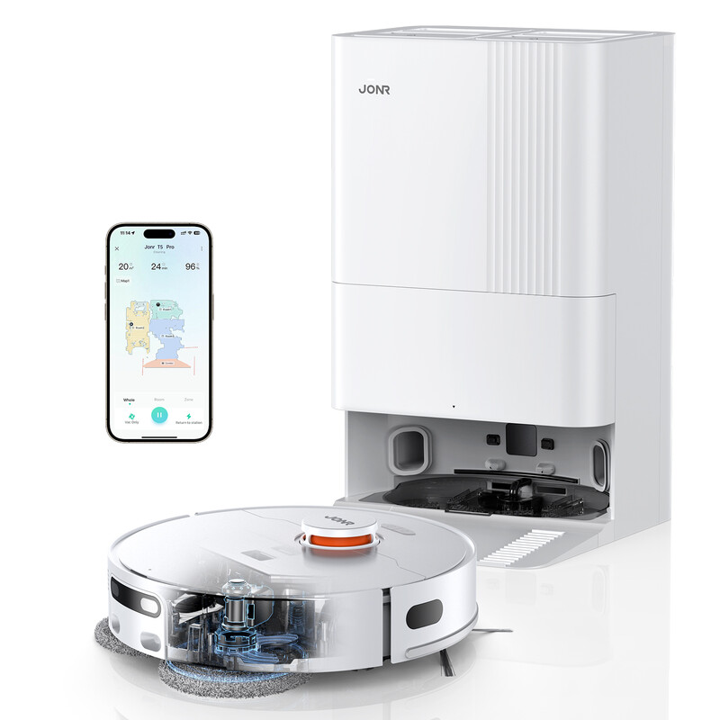 JONR T5 Pro Robot aspirateur et laveur 8150 Pa avec séchage à l'air chaud, brosse latérale anti-enchevêtrement, reconnaissance des obstacles, navigation laser et station tout-en-un