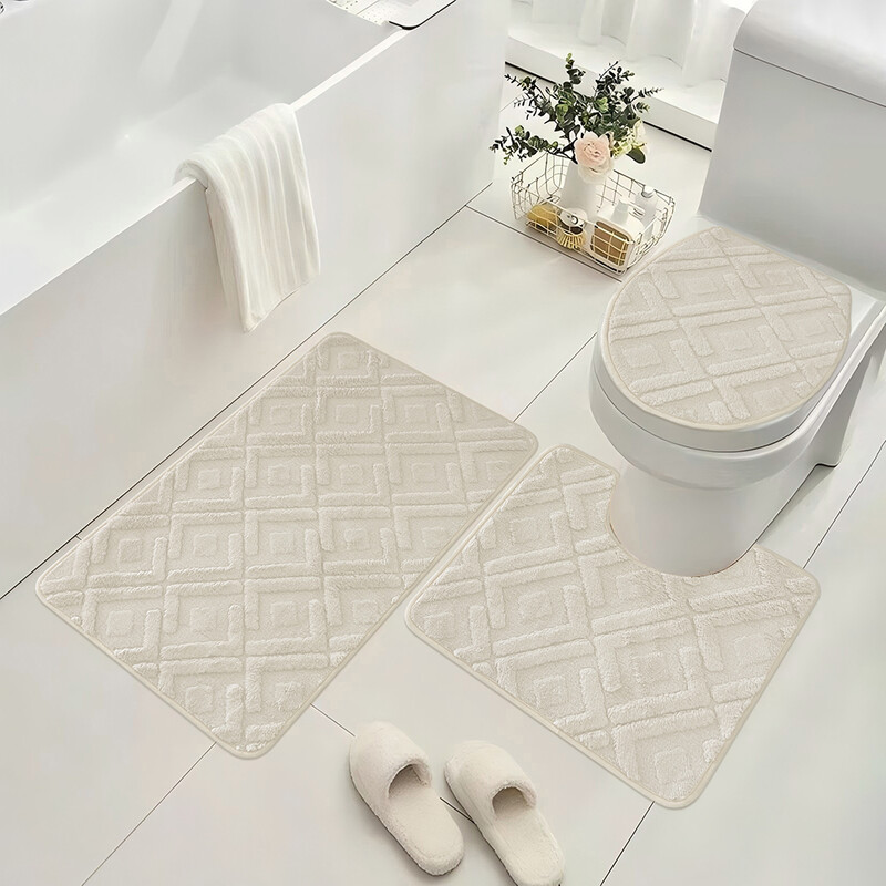 Ensemble de Salle de Bain 3 Pièces Antidérapant et Absorbant pour Baignoire et Douche, Lavable en Machine – Housse de Cuvette 38×44cm, Tapis Contour en U 50×40cm, Tapis de Bain 50×80cm – Motif Méandre Beige