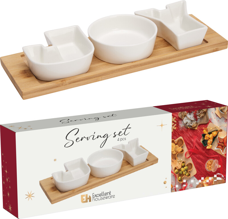 Koopman Bamboe Serveer Set met Porseleinen Schalen - 4 stuks, Kerstontwerp