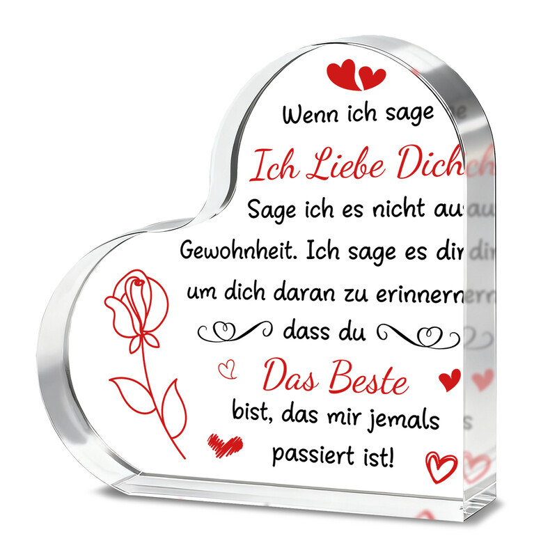 Alphynix 1 Stück Glas-Plakette mit deutschem Liebesherz, romatisches Geschenk mit dem kompletten Zitatstext „Wenn ich sage Ich liebe dich...“ und handgezeichneter Rose, Geschenk zum Jahrestag