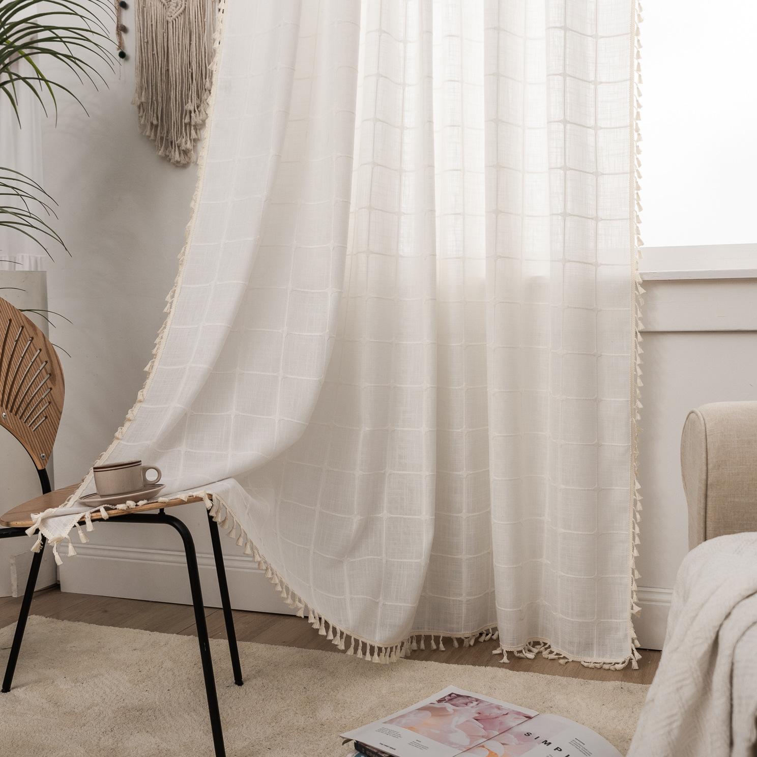 Vorhang Fertigprodukt, Baumwolle und Leinen Karomuster Milchweiß mit Fransen Erkerfenstervorhang