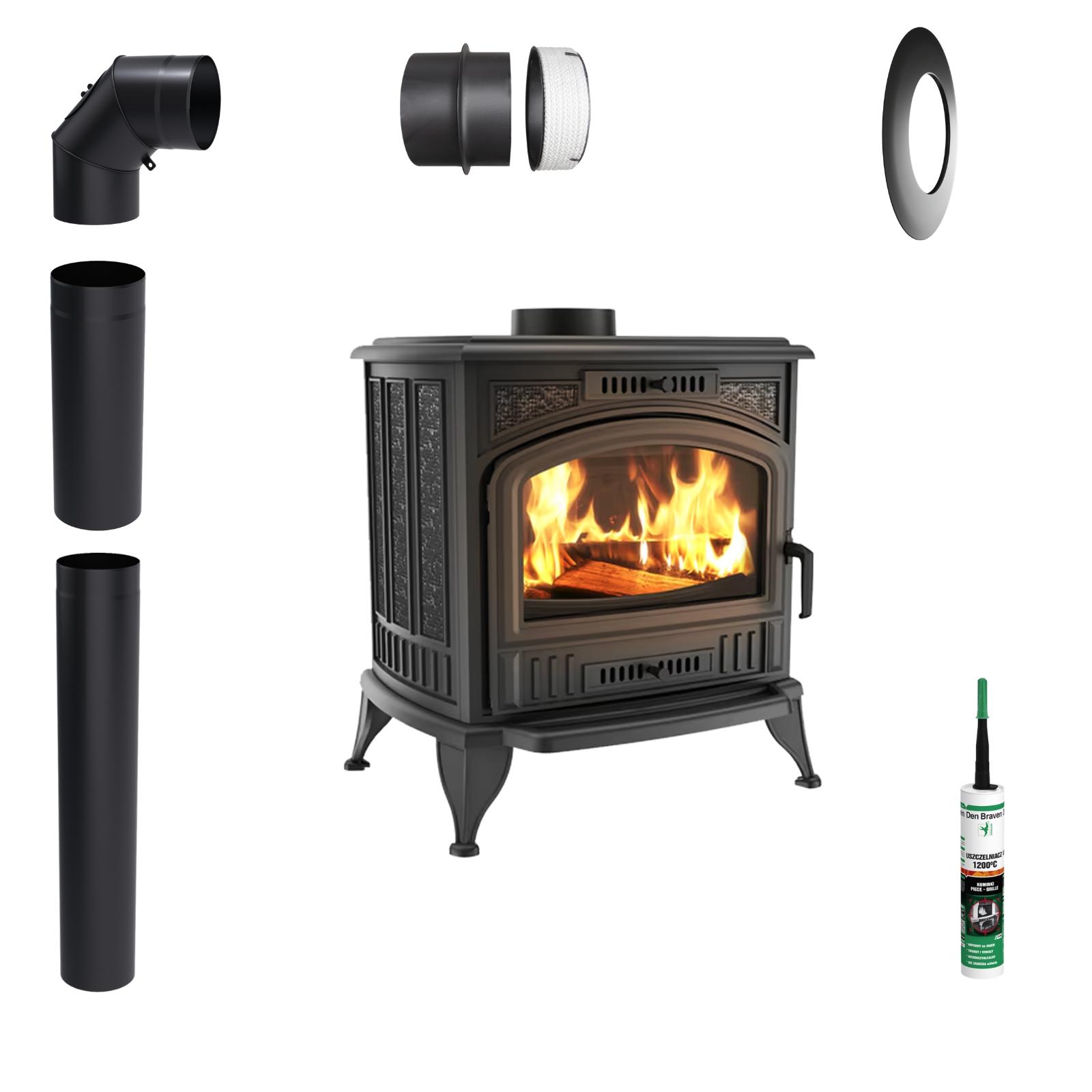 Piec z płaszczem wodnym żeliwny kominkowy KRATKI Koza K6 8 kW Ø 150 zestaw