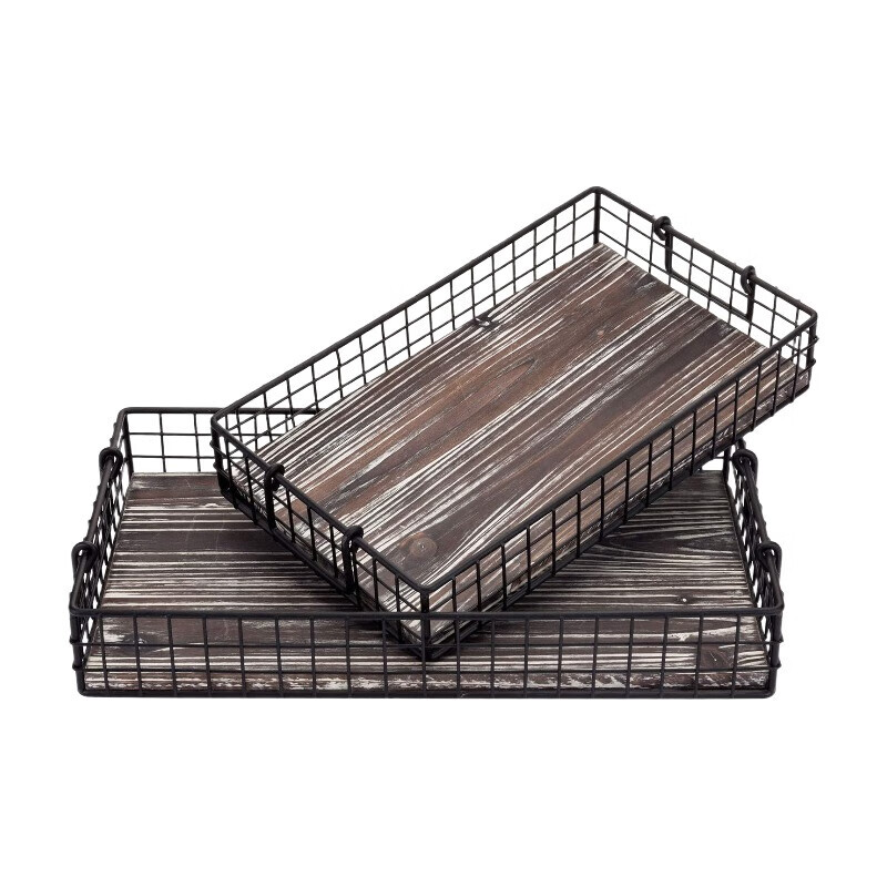MyGift 16 und 14 Zoll große ineinander stapelbare Arbeitsplatten-Aufbewahrungskörbe mit Griffen, rustikales verbranntes Holz und schwarzer Metalldraht Dekorative Regal-Organizer-Behälter, 2-teiliges Set
