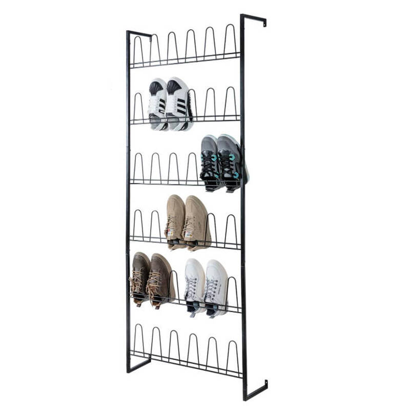 MyGift 70 Zoll schwarzer Metall-Schuhorganisator für Eingangsbereich, Wandmontiertes Schuhregal für Schrank mit 36 Haken, Platz für bis zu 18 Paar