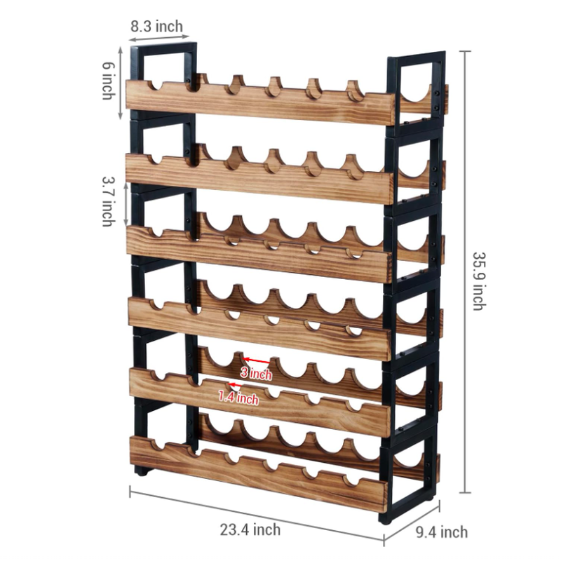 MyGift 6-stufiges freistehendes Weinflaschenregal mit verbranntem Massivholzregal und industriellem mattschwarzem Metallrahmen, Große horizontale Weinbar-Aufbewahrung für 36 Flaschen