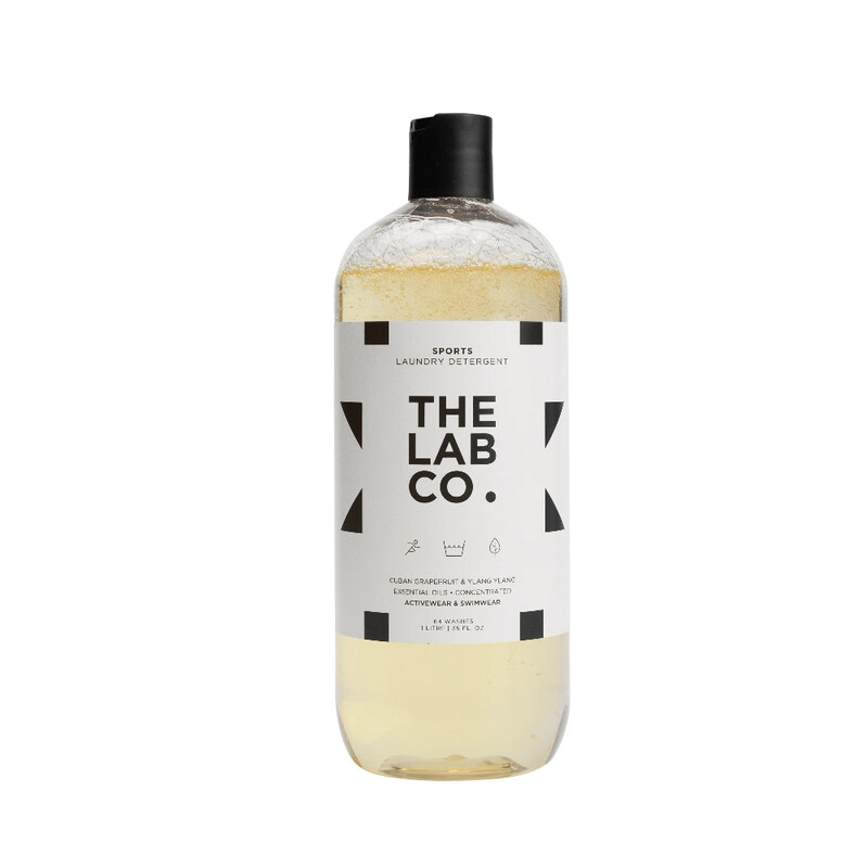 The Lab Co. Sports Laundry Wash. 1 litre for up to 64 washes. Cuban Grapefruit and Ylang Ylang. For active-wear and swimwear. Non-Bio detergent suitable for hand-wash and machine washing.
