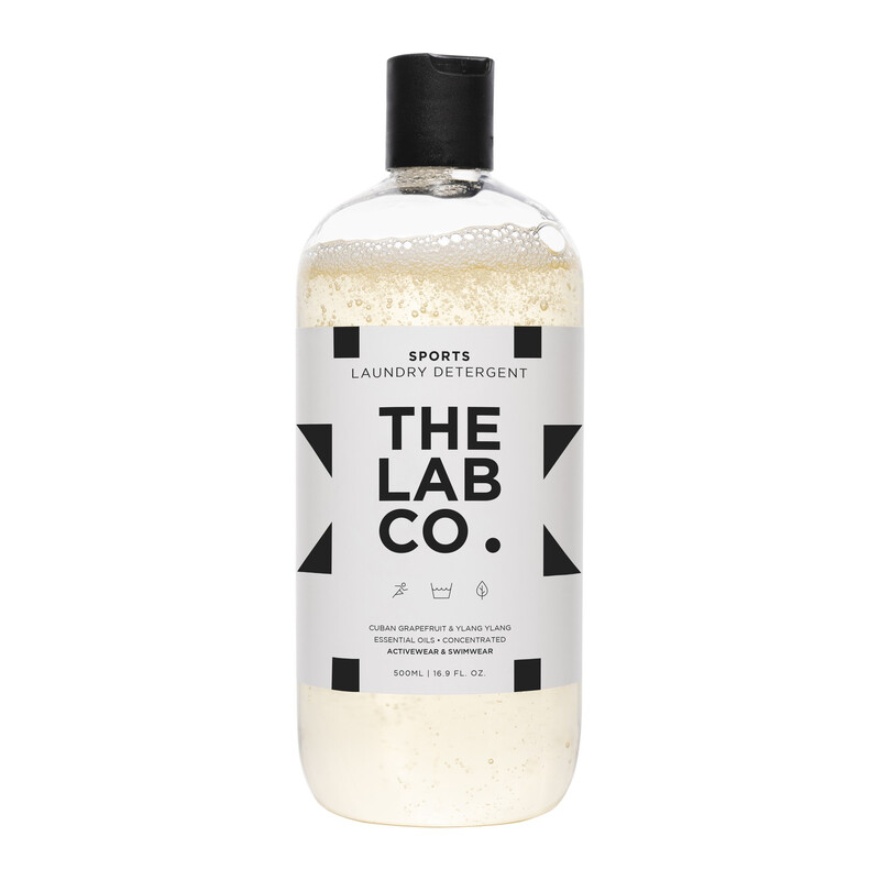 The Lab Co. Sports Laundry Wash. 500ml for up to 32 washes. Cuban Grapefruit and Ylang Ylang. For active-wear and swimwear. Non-Bio detergent suitable for hand-wash and machine washing.