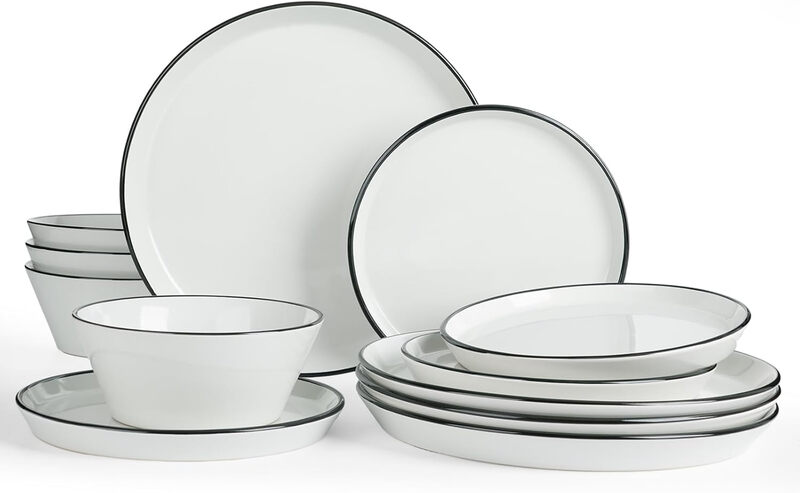 Richmount 12-teiliges konisches Geschirrset mit schwarzem Rand - Reinweiß