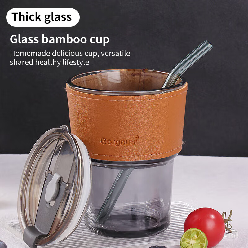 BJ Glas-Wasserbecher mit Strohhalm – tragbarer Kaffeebecher, hitzebeständig, rauchgrau, 400 ml, Einzelpack