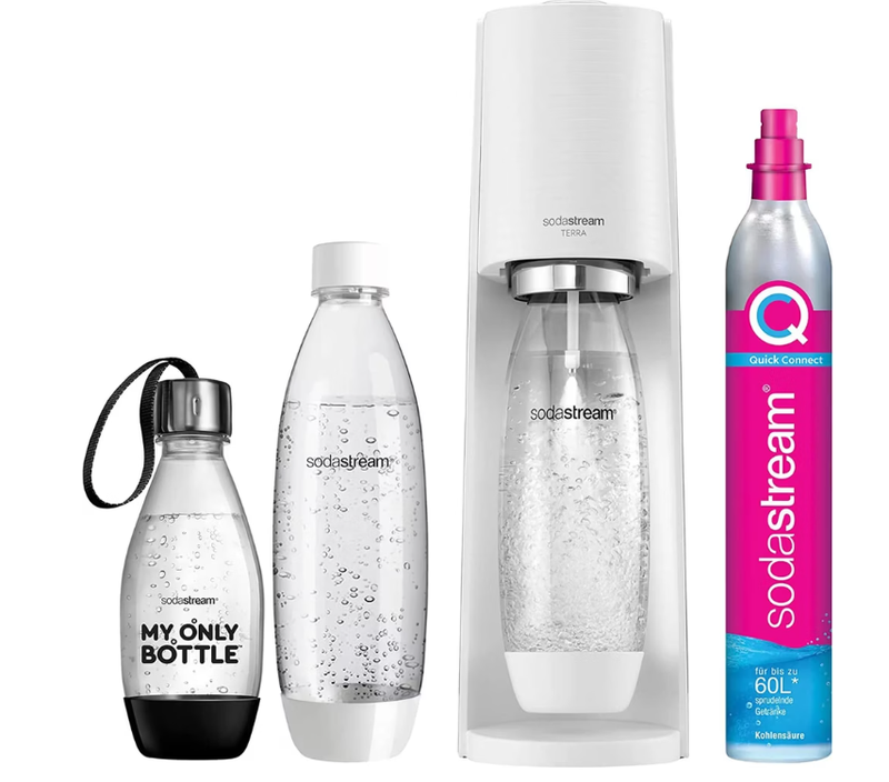SodaStream TERRA Sparpaket Wassersprudler mit CO2-Zylinder, 2 x 1 L spülmaschinenfeste Kunststoffflaschen und 1 x 0,5 L spülmaschinenfeste Kunststoffflasche, Höhe 44cm, weiß, 1012813490