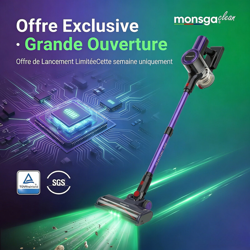 MonsgaClean M100 Aspirateur balai sans fil 55 000 Pa avec 50 min d’autonomie, écran tactile, lumière verte, anti-emmêlement, autoportant et rechargeable - Violet