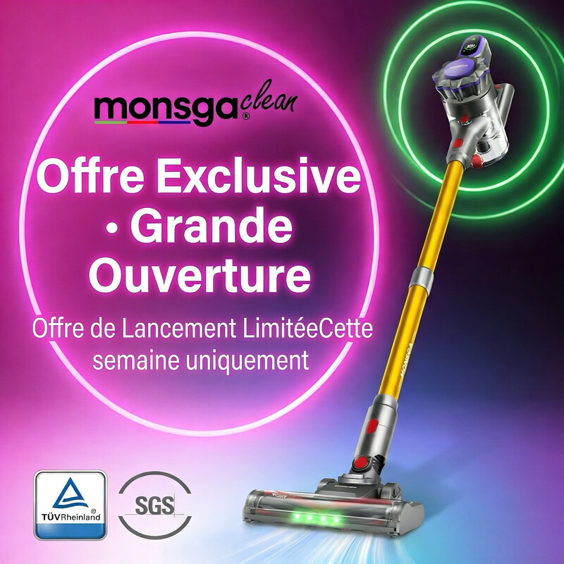 MonsgaClean MV3 Aspirateur balai sans fil 45 000 Pa, 550 W avec 60 min d’autonomie, design autoportant, articulation flexible, technologie GreenEye et brosse anti-enchevêtrement