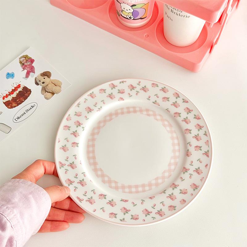 1Pc Pink Floral Ceramic Dinner Plate, Lace-Edged Girly Pink Hand-Painted Small Floral French Plate, Light Snack Salad Plate, pink