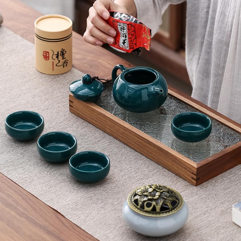 Kungfu tesett Røkelsesbrenner Gaveeske Seremoni Én gryte Fire kopper boks Sandeltre Komfyr Kinesisk keramikk bærbar i bil kopp bar mørk grønn farge