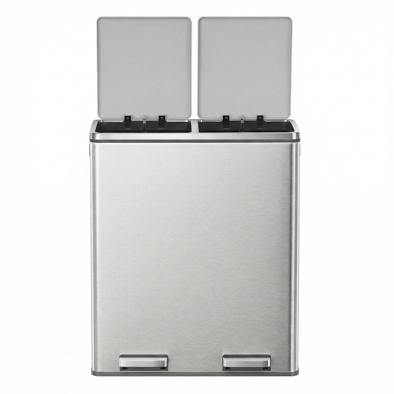SONGMICSHOME Kitchen Bin with 2 Compartments, 2 x 30 L Double Rubish Bin with Lids, Pedals, Plastic Inner Buckets, Soft Close, Silver and Black